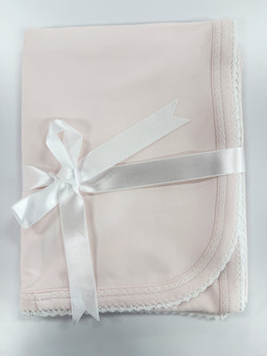 Pink with white trim blanket by squiggles.